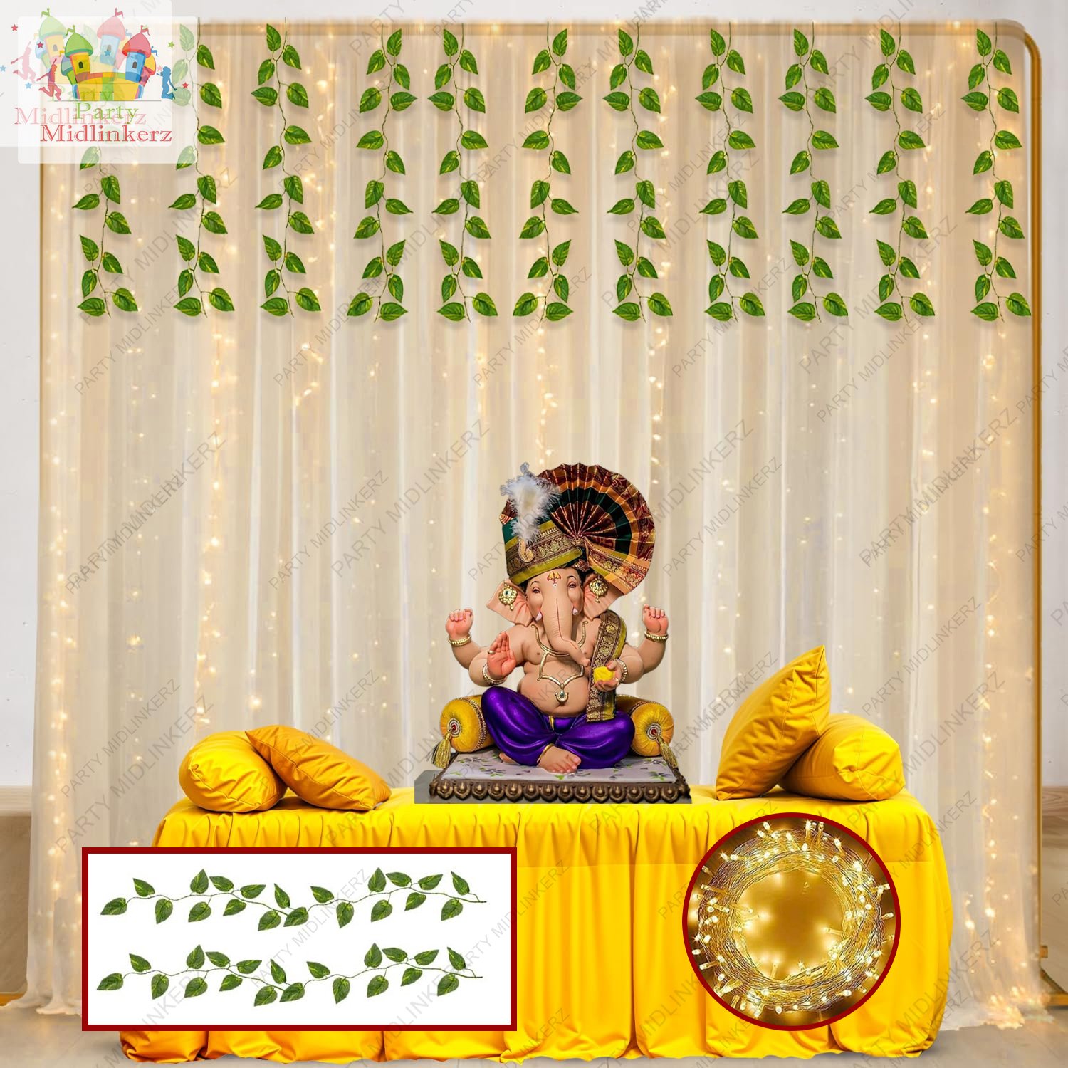 • LARGE 8 PCS | BACKDROP FOR POOJA DECORATION :-This ganpati decoration items for home included 2 pieces of yellow net curtains, 1 piece of led light, 2 pieces of artificial leaves for decoration wall, 2 pieces of hooks and 1 piece of ribbons. These elegant janmashtami decoration items with white net curtains are perfect for adding a touch of grace and sophistication to your any ceremony like Haldi Mehndi ceremony, ganpati decoration mandap, ganpati decoration background, ganesh decoration mandap.