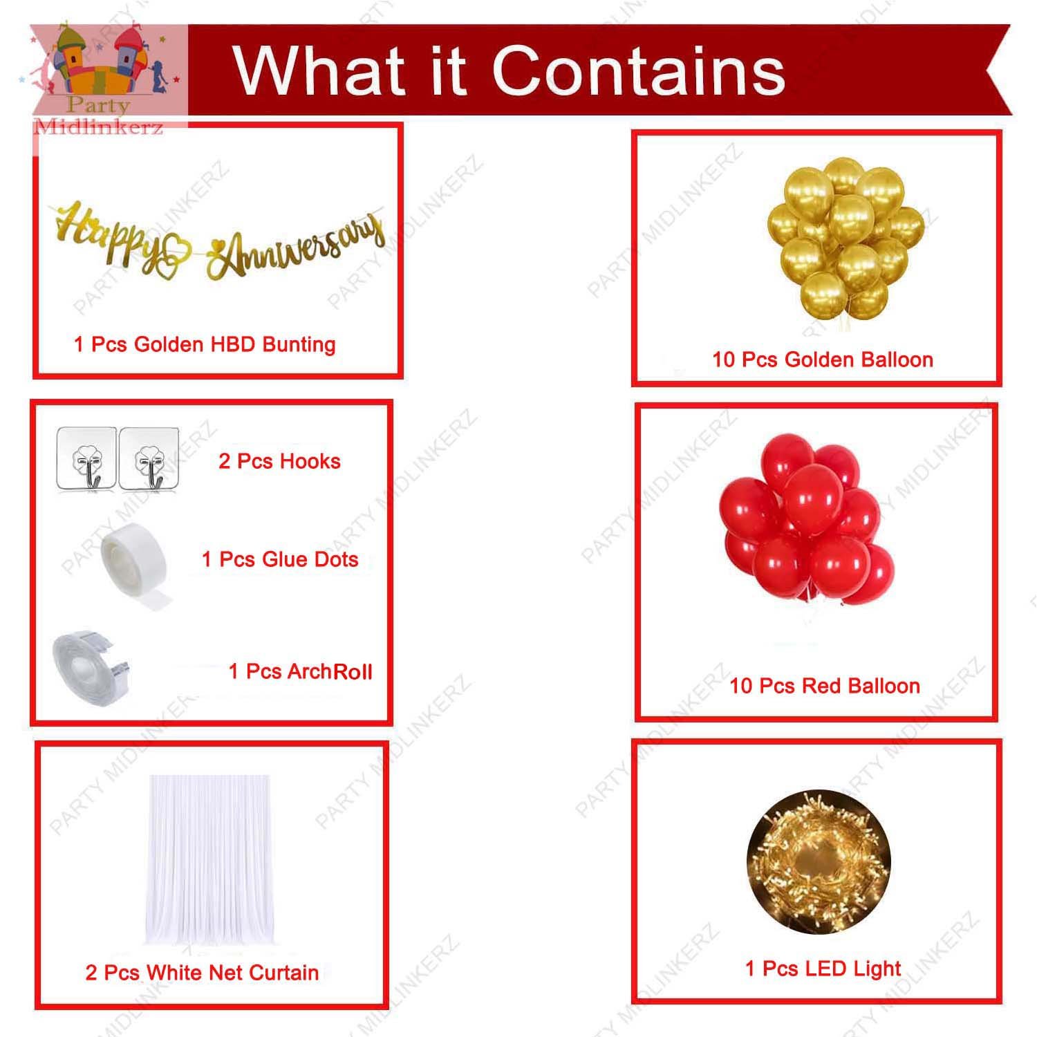 Happy Anniversary Decoration Items Kit – 28 Pcs Canopy Tent for Decoration, Wedding Anniversary Decoration Balloons and Banner, White Net Canopy for Decoration