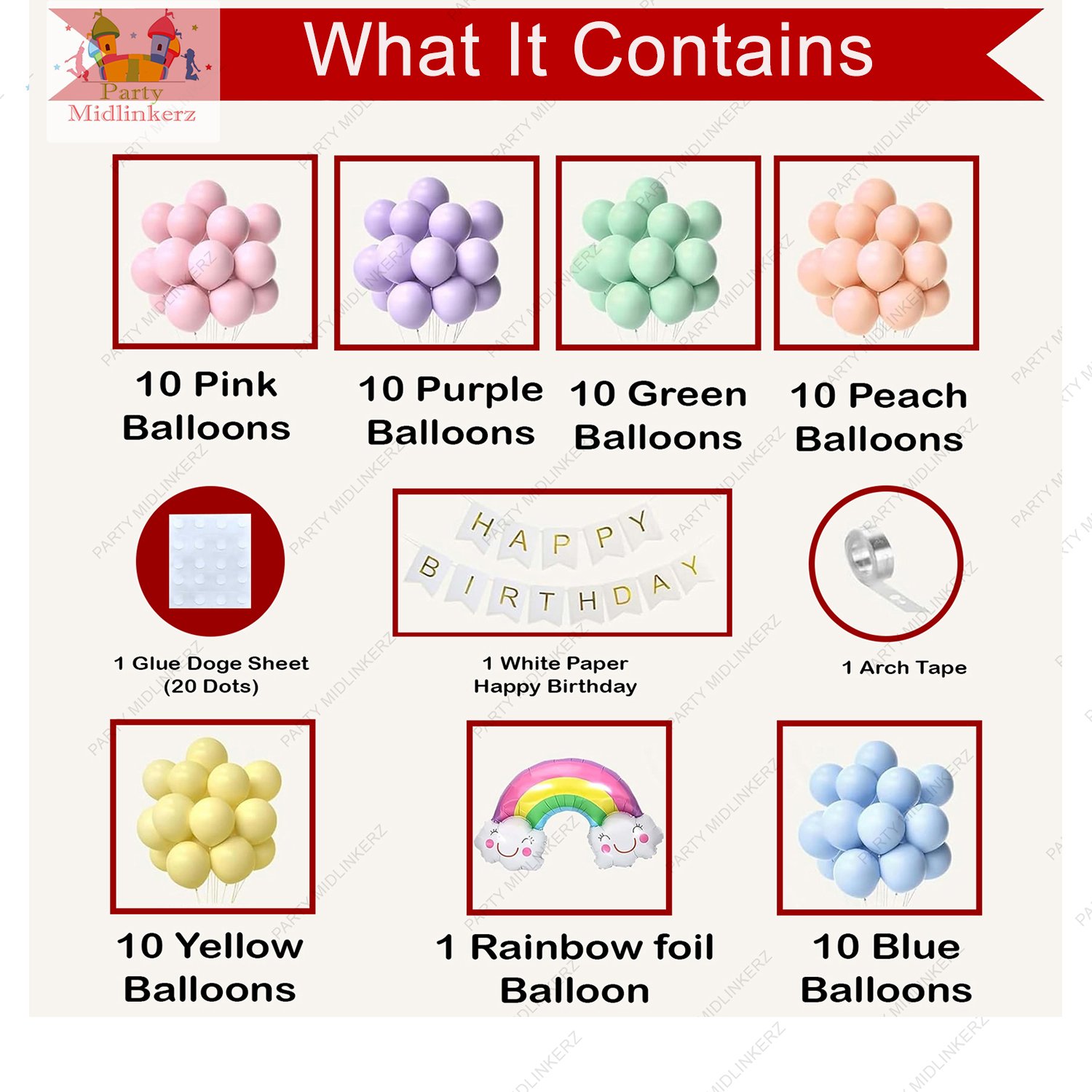 - [ PACKAGE INCLUDED]: you will get 68 pcs of premium quality items, 1 pcs White happy Birthday paper banner, 1 Rainbow Theme 5pc Foil Balloon set, 10 pcs Pink balloons, 10 pcs Blue balloons, 10 pcs Purple Balloons, 10 pcs Green Balloons, 10pcs Peach Balloons,10 pcs Yellow Balloons, 1 pcs Arch Tape, 1 pc glue dot sheet. You will get enough quantity to prepare an unforgettable rainbow theme birthday decoration for kids, girl and baby boy.