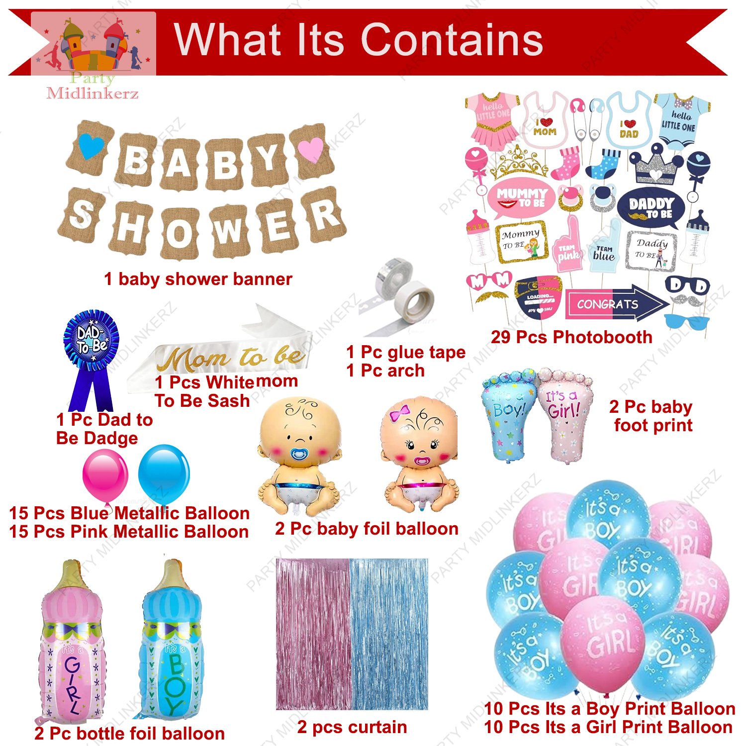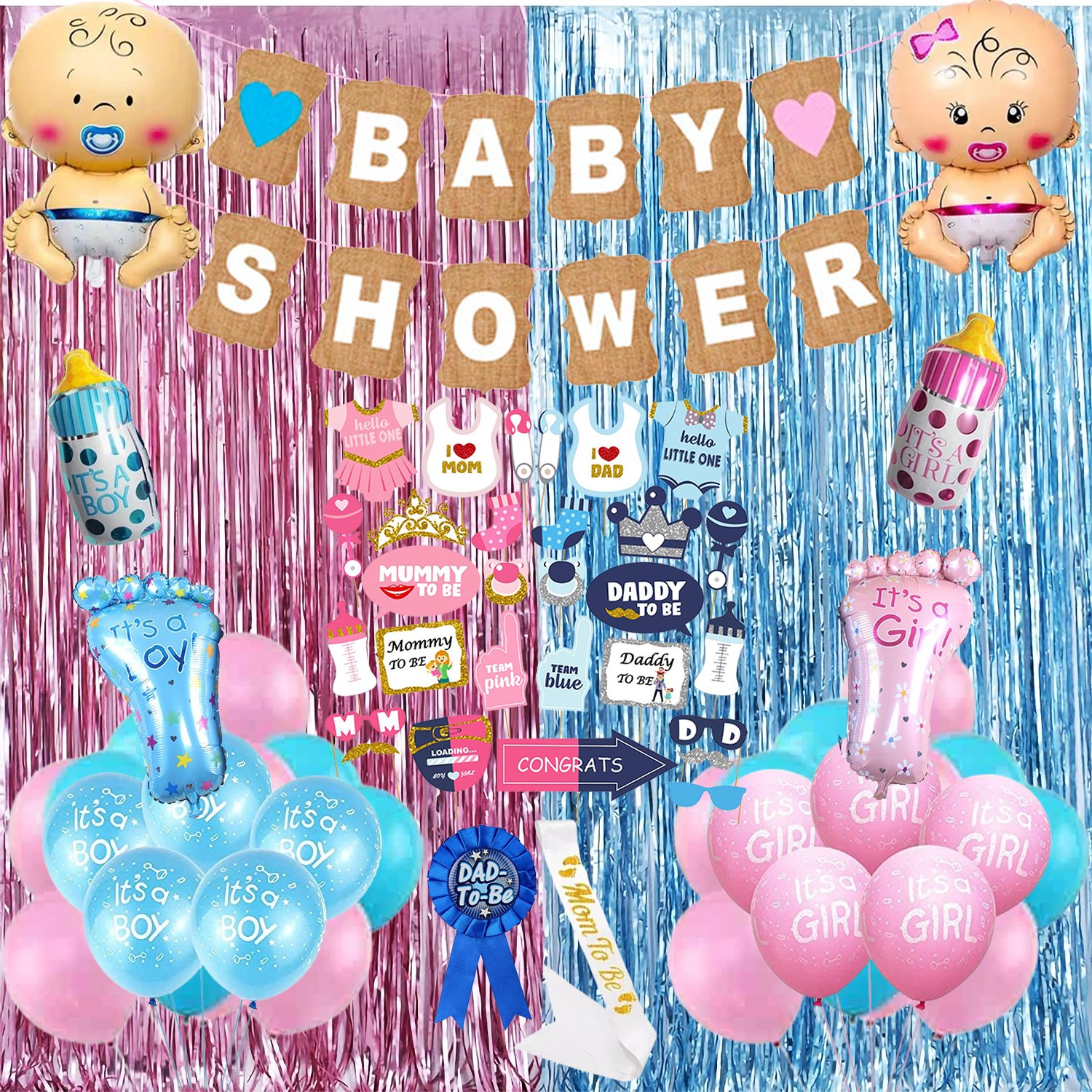 EXCLUSIVE BABY SHOWER DECORATION KIT : This babyshowerdecoration kit includes many baby shower decoration items of 92Pcs Combo which is 1pc baby shower cardstock banner, 10pcs it’s a latex balloons, 10pcs it’s a latex balloons, 30pcs metallic balloons, 2pcs baby foil balloon, 2pcs baby feet foil balloon, 2pcs feeding bottle foil balloon, 2pcs & foil curtain, 1pc mom to be satin sash, 1pc dad to be badge, 29pcs photobooth boards, 1pc glue dot, 1pc ribbon. This baby shower balloons set has been curated after a high demand from our “Party Propz” customers.