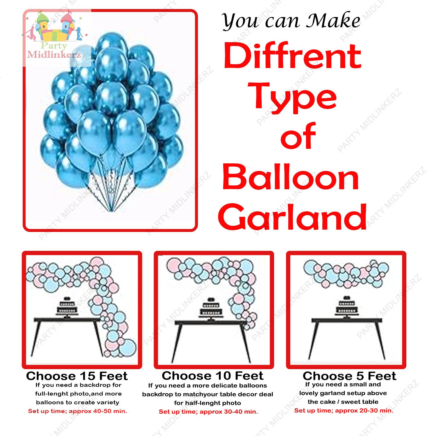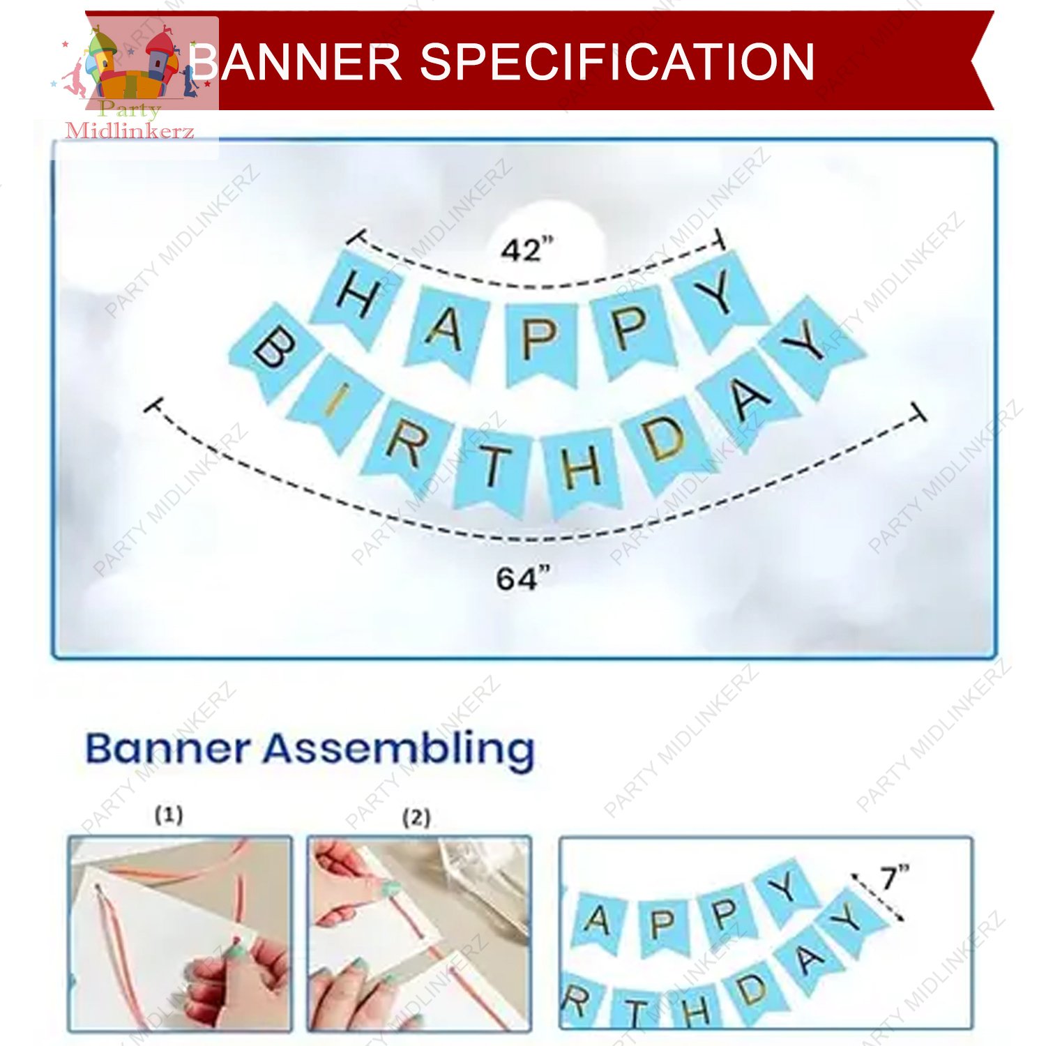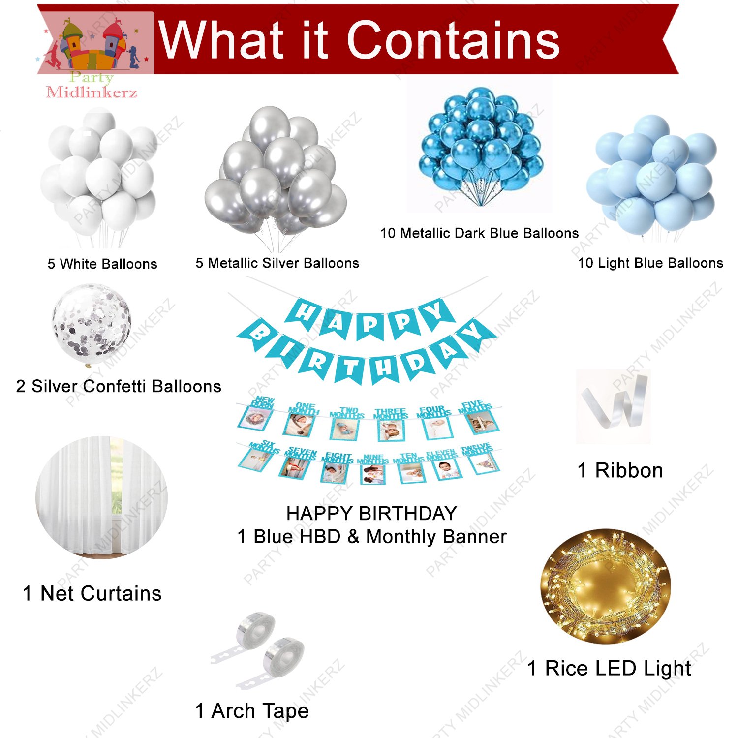 Be the first to review “Midlinkerz Blue Birthday, Photo Banner, LED, Arc Ribbon, Net, 30 balloon & 2 Confetti (Set of 38)”