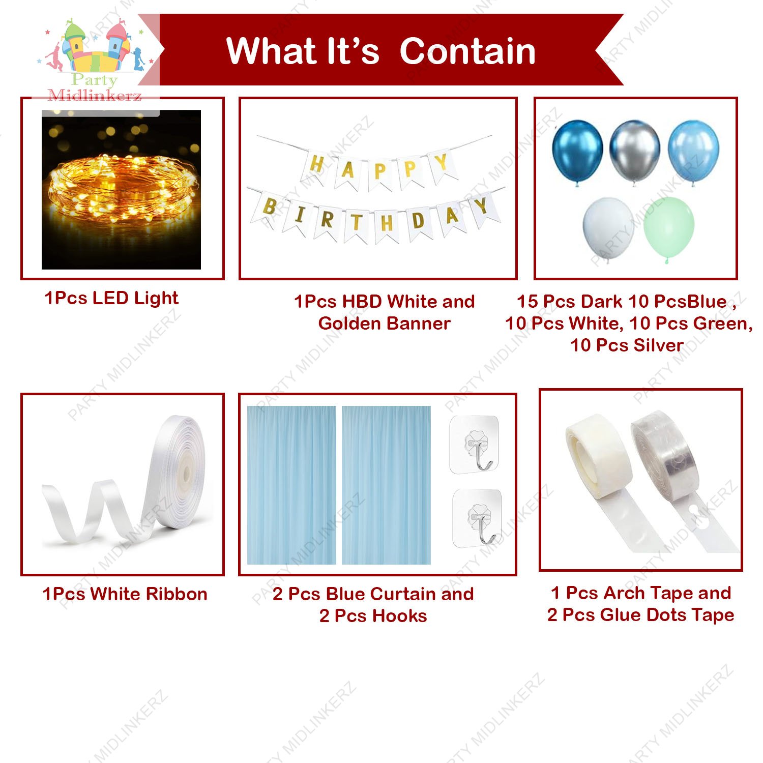 • 【Blue Balloon Garland Kit】 birthday theme decoration for boys 2 pcs, blue net curtain, 1 pcs LED lights, 15pcs Dark Blue Balloons, 10pcs Mint Green Balloons,10pcs White balloons, 2pcs silver chrome balloons,15pcs blue balloons, 1 white birthday banner,2pcs Hooks,1 pcs Ribbon, birthday balloon decorating strip for blue balloon arch Kit, blue balloon garland kits/baby blue balloon garland kit.
