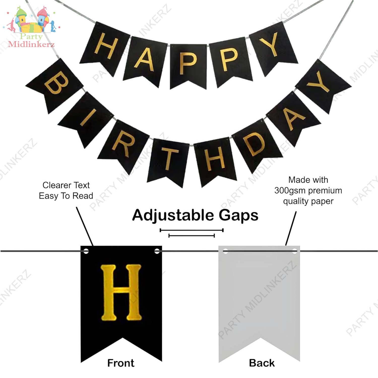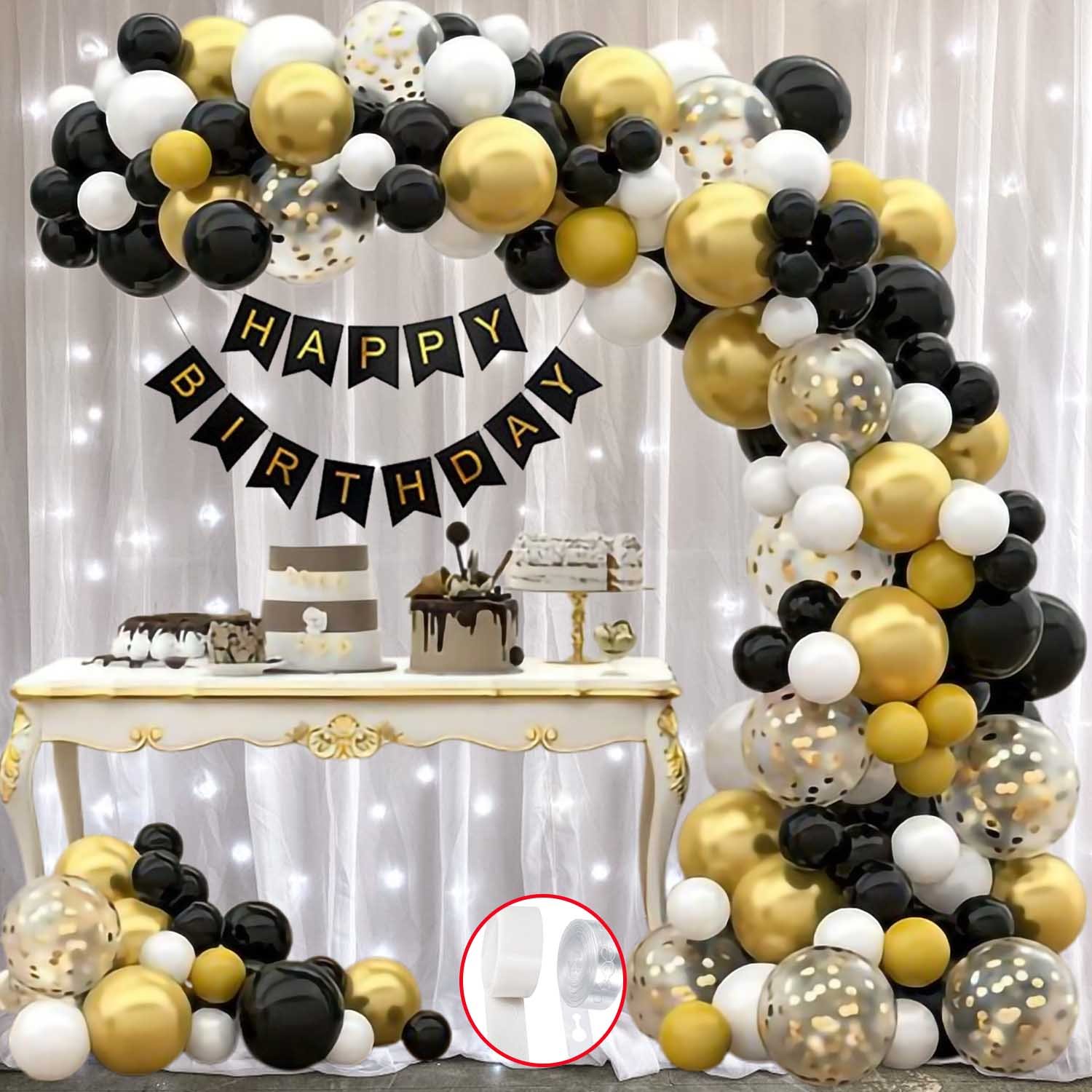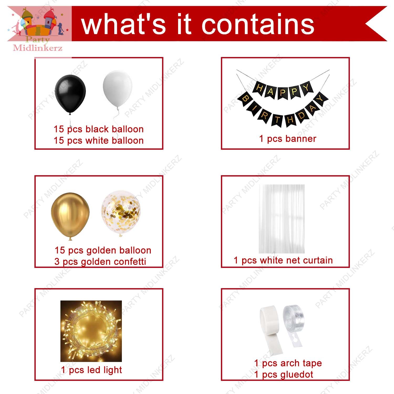Package Include Happy Birthday Decoration Combo Kit pack of 53 Pcs, Happy Birthday Black Banner 1 Pcs, 45 Pcs Golden Black and White Metallic Balloon, 3 Pcs Confetti Balloon, 1 Pcs White Net Curtain, 1 Pcs Light, 1 Pcs Balloon Arch and 1 Pcs Balloon Glue, for Happy Birthday Decoration Black Golden and White Birthday Decorations Combo Set (Pack of 53)