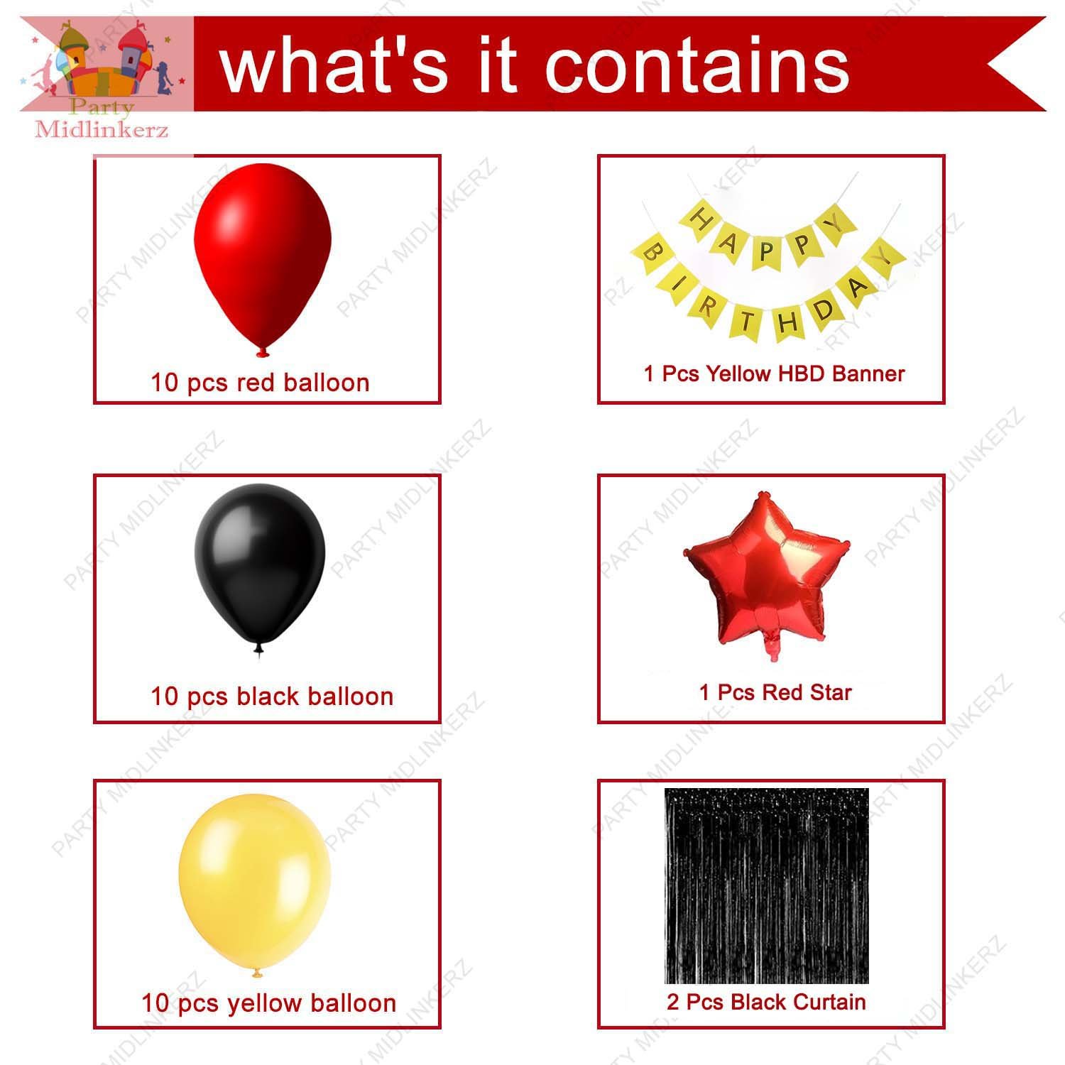 - Package Included:- 1 Pcs Yellow Happy Birthday Banner 2 Pcs Red Star Shape Foil Balloons 25 Pcs Red Black and Yellow Metallic Balloons 3 Pcs Red Confetti Balloons 2 Pcs Black Foil Curtain