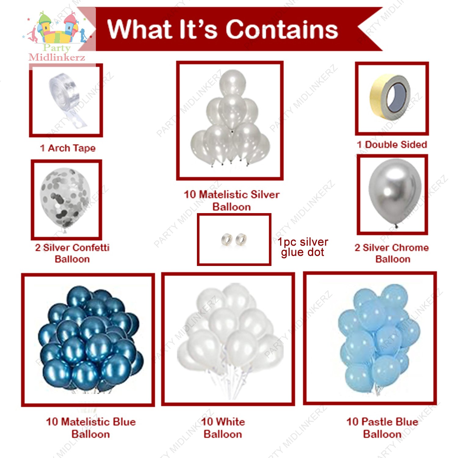 • [Inside the box] The kit includes 10 pcs blue metallic balloons for decoration , 5pcs silver chrome happy birthday ballloons , 3pcs silver confetti balloons, 10pcs blue pastel balloons for decoration , 10pcs white balloons for birthday , 10pcs silver metallic balloons for decoration & 1pc arch strip for balloon garland & 1pc gluedot sheet.