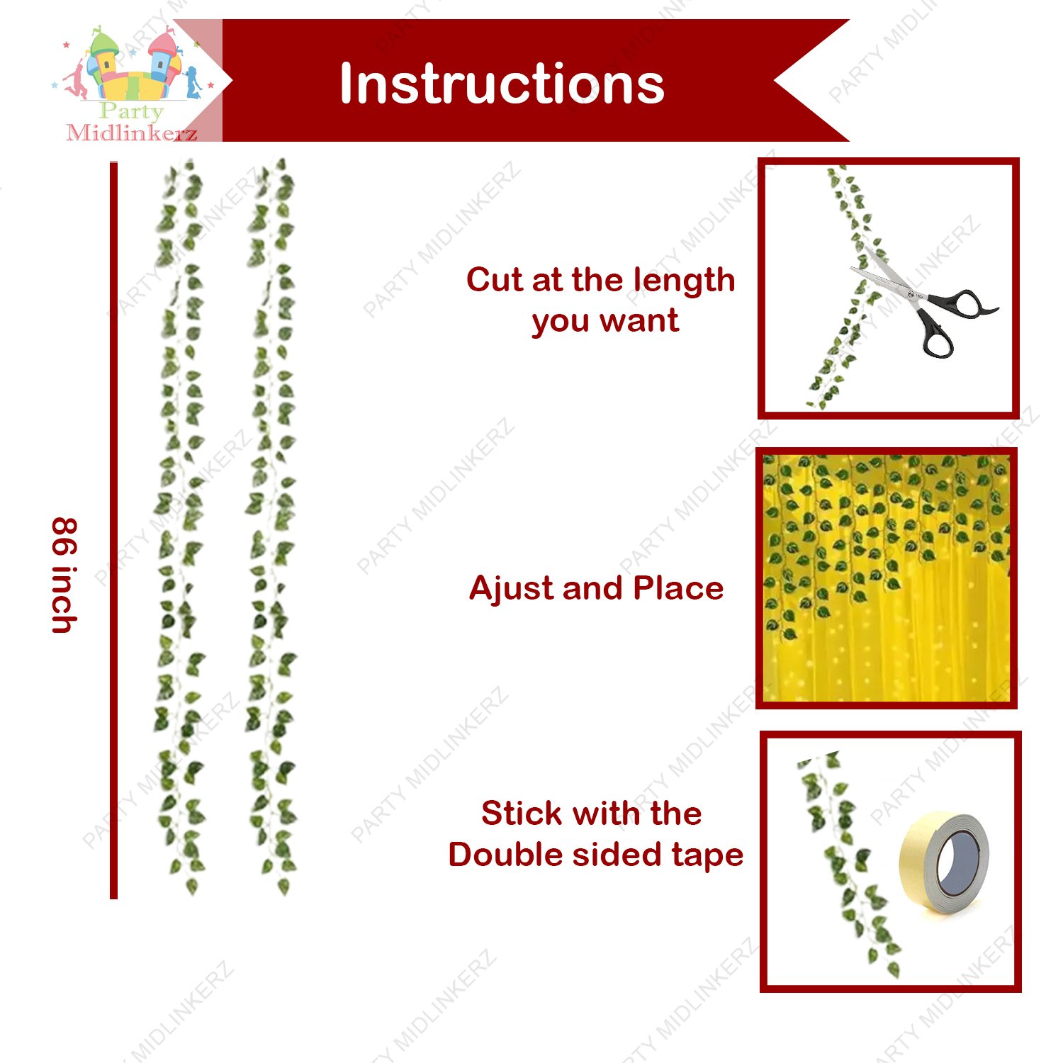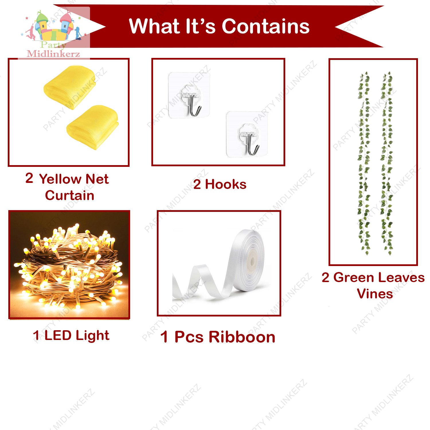 • [What will you get?] Diwali decoration items kit Include: 2 Green Vines artificial hanging Leaves. Each green vine is almost 7 ft long and has 80 leaves. You will also get a 1 pcs LED light and 2 pcs Yellow net curtains, enough Diwali decoration material to Create a Diwali pooja decoration background.