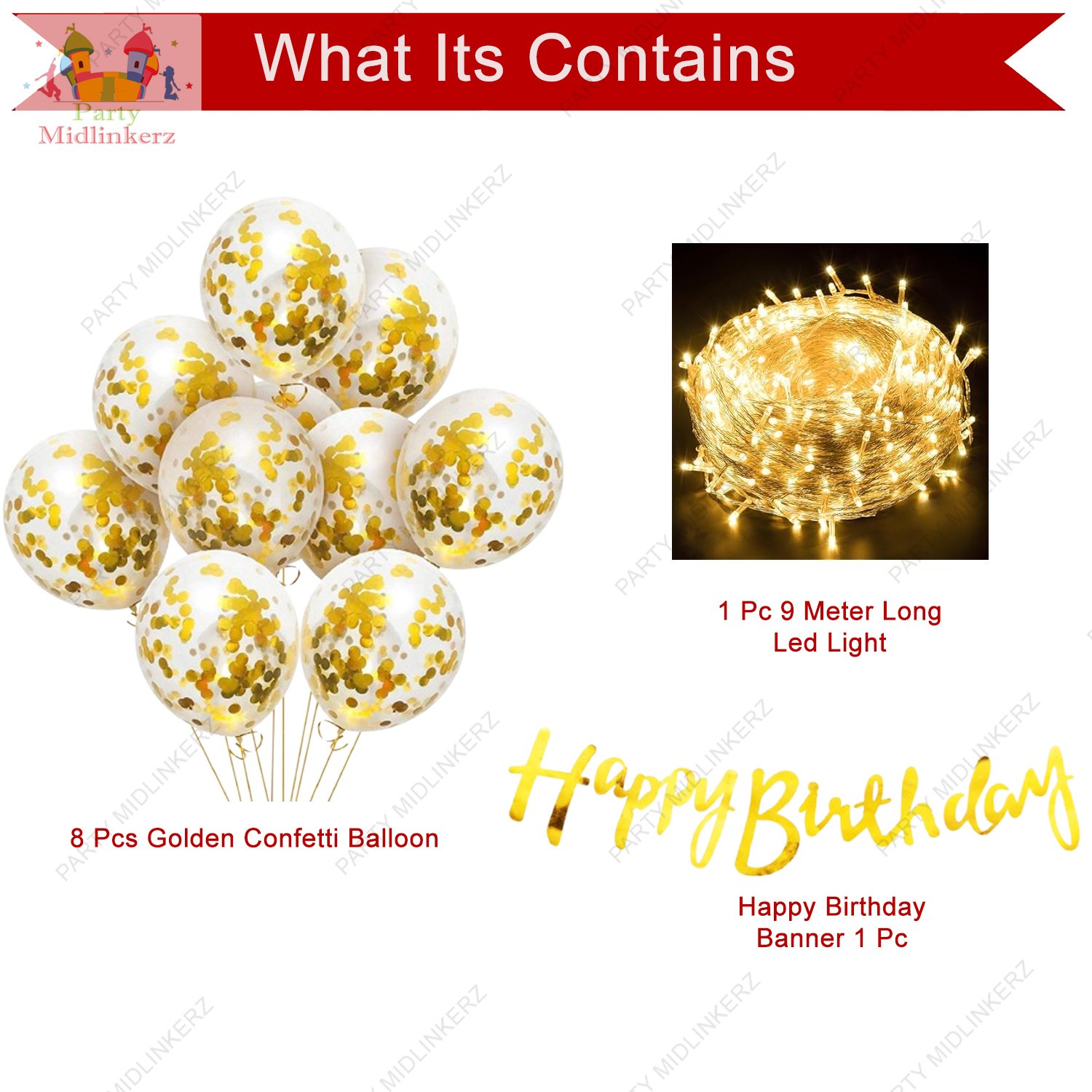 EXCLUSIVE BIRTHDAY BALLOONS FOR DECORATION INCLUDES: 1Pc golden happy birthday banner (Cardstock), 8Pcs golden confetti balloons for birthday decorations and 1Pc led light for decoration 9 Meter long. This birthday decoration kit with led light is very trending now and make one of the best birthday backdrop for your loved ones. This set has been curated by us Party Propz after huge demand from our lovely customers.