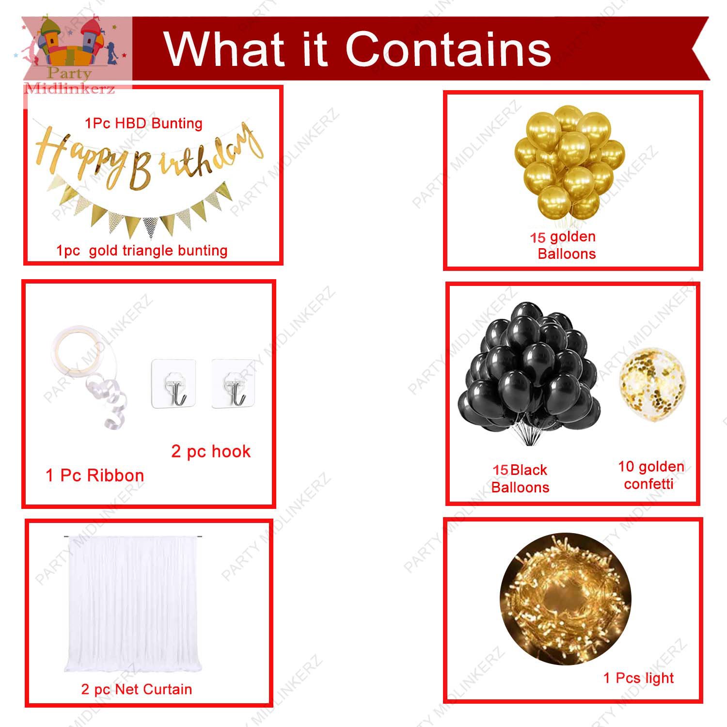 1 Pc Happy Birthday Cursive Banner, 1 Pc Zig Zag Bunting, 1 Pc LED Light Strip, 2 Pcs Net Curtain, 15Pcs Black Balloons, 15Pcs Golden Balloons and 10 Pcs Golden Confetti Balloons, 1pc ribbon