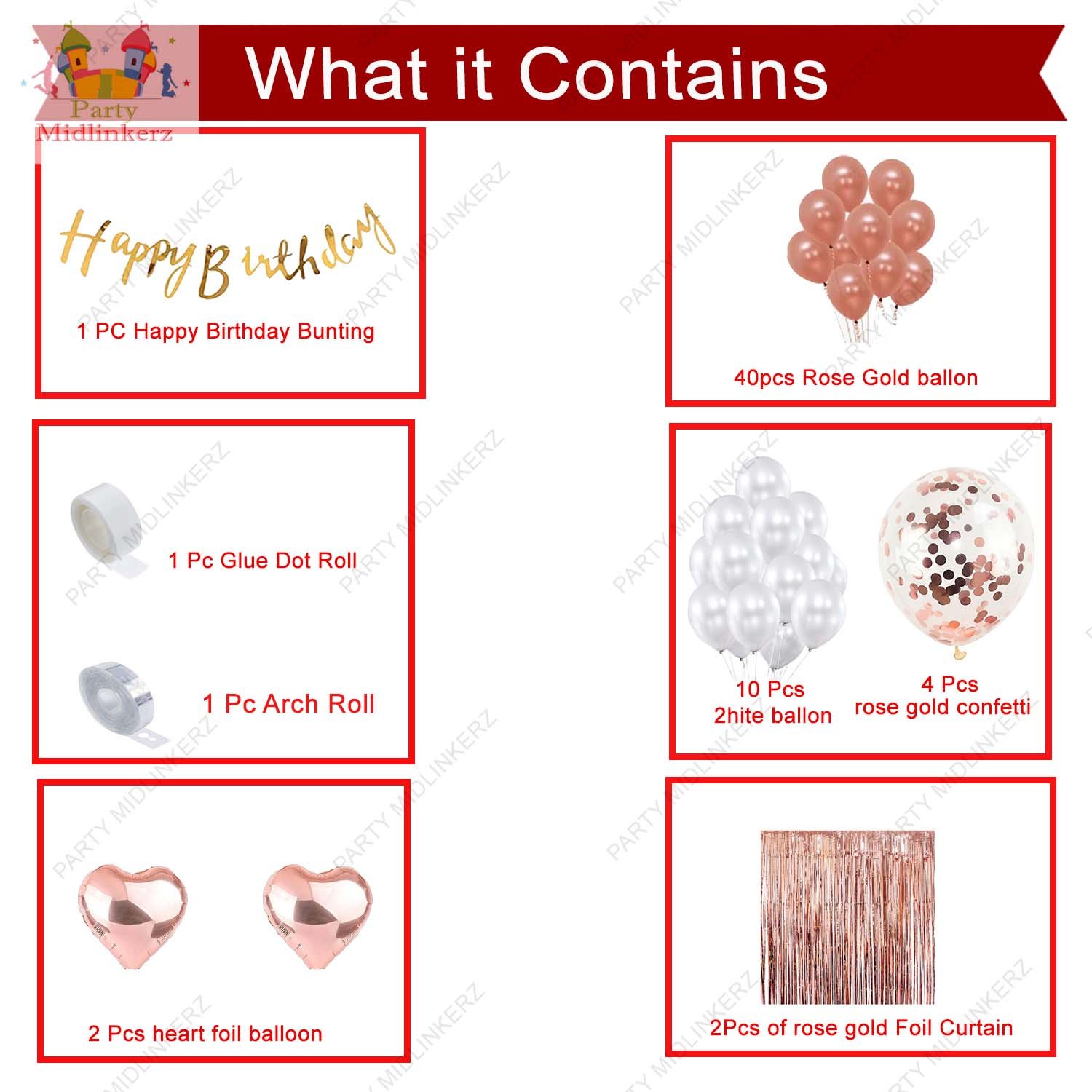 Solid Happy Birthday Balloons Decoration Kit 68 Pcs, 1 set of Black “Happy Birthday” 13pcs alphabet Banner and 40pcs HD Metallic balloons(Rose Gold) and 10 White Balloons, 3Pcs Rose Gold Confetti Balloons, 2Pcs of Heart Balloons (2 Rose Gold), with 2Pcs of Rose Gold Curtains for Kids Wife Girl Birthday Balloons Decorations Items Combo with Happy Birthday Banner, 1st Birthday Latex Metallic Balloons Balloon (Multicolor, Pack of 61)