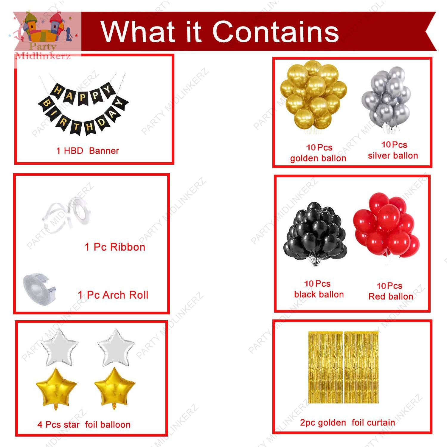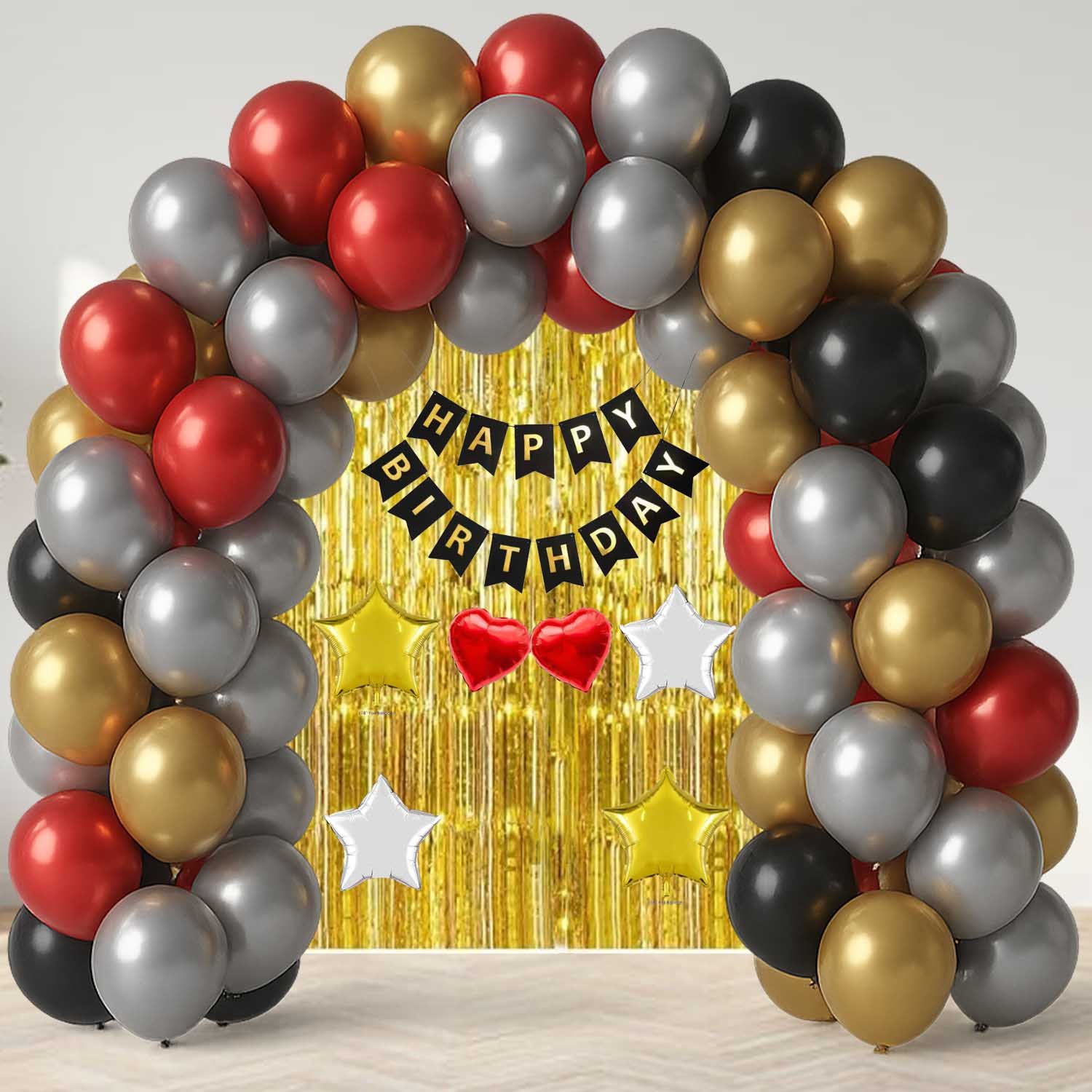 Solid Happy Birthday Balloons Decoration Kit 49 Pcs, 1 set of Black “Happy Birthday” 1 pcs alphabet Banner and 40pcs HD Metallic balloons(Golden, Black, Silver, Red) and 4Pcs of Star Balloons (2 Gold, 2 Silver) 1Pcs of golden Curtains for Kids Husband Wife Girl Birthday Balloons Decorations Items Combo with Happy Birthday Banner, 1st Birthday Latex Metallic Balloons Balloon (Multicolor, Pack of 49)