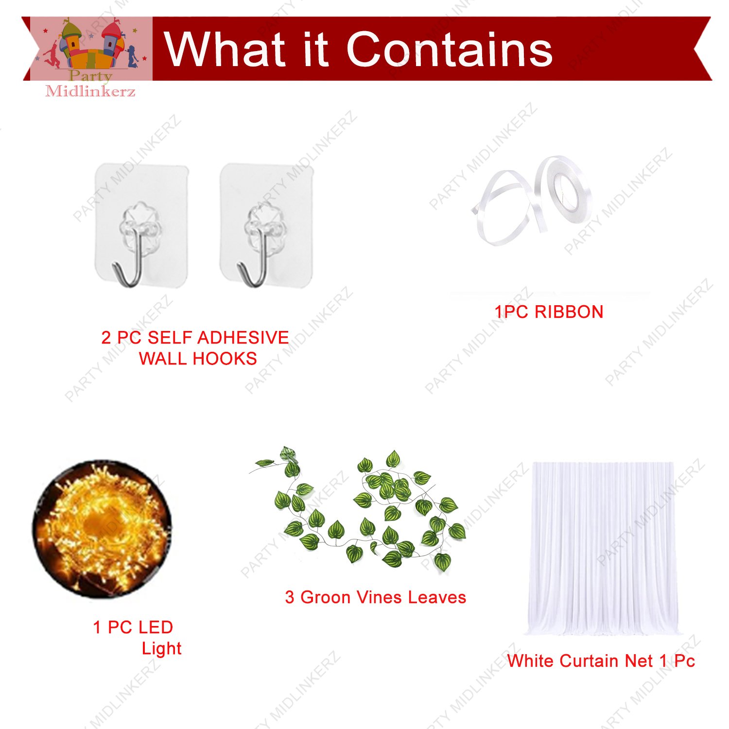 - [INSIDE THE BOX]: You will get a total of 9 pieces of premium quality items, 2 white net cloth, 1 pcs of LED lights 40ft long, 3 pcs of artificial green leaves for decoration, 2 pcs of hooks and 1 pcs of ribbon