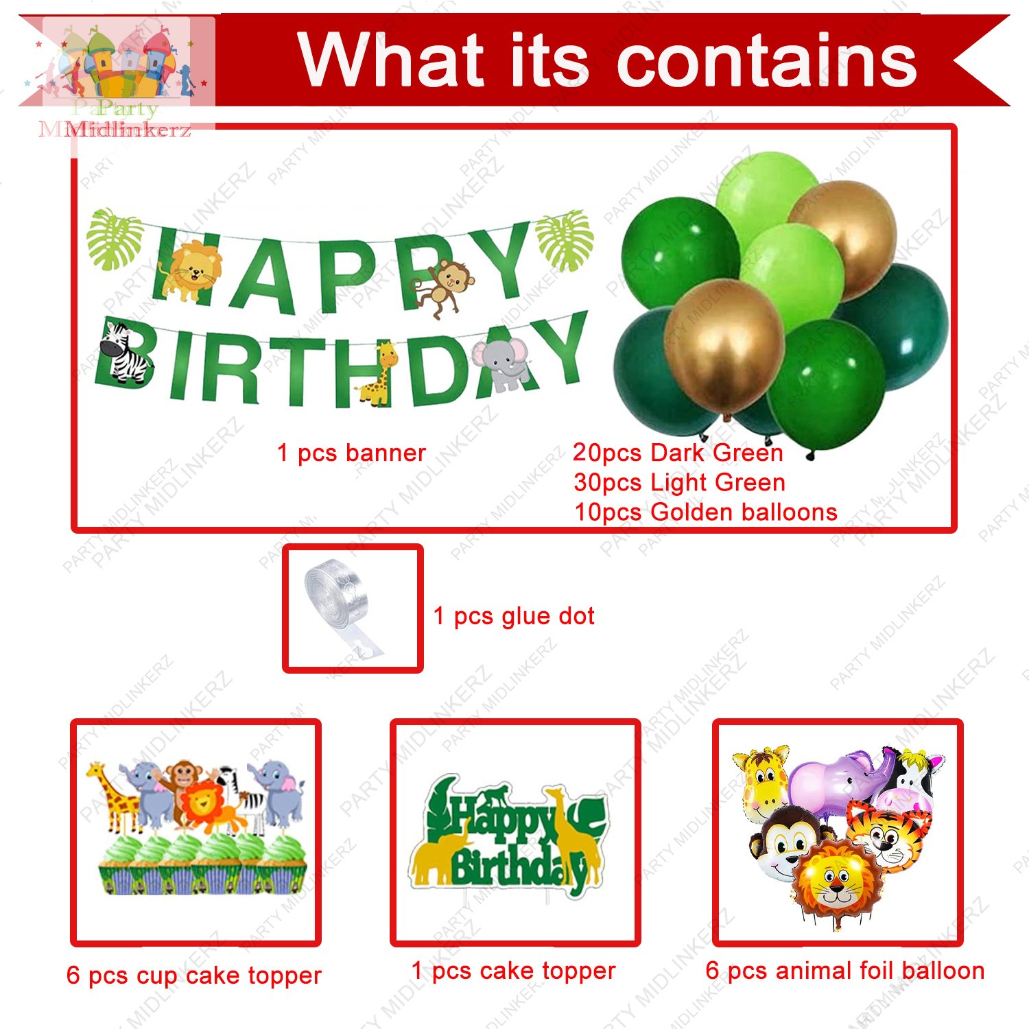 - DIFFERENT VARIETY OF ANIMAL FOIL BALLOONS – Giraffe, Elephant, Cow, Monkey, Tiger, Lion which are HELIUM SUPPORTED. This Complete Pack of Jungle Decoration Kit includes 1pc Jungle Theme Happy Birthday paper Bunting, 1pc Cake Topper, 6pcs Cupcake Toppers, 6pcs Animal Foil Balloons, 30 Pcs Dark Green, 30pcs light green, 10pcs golden metallic, and 1pc arch.