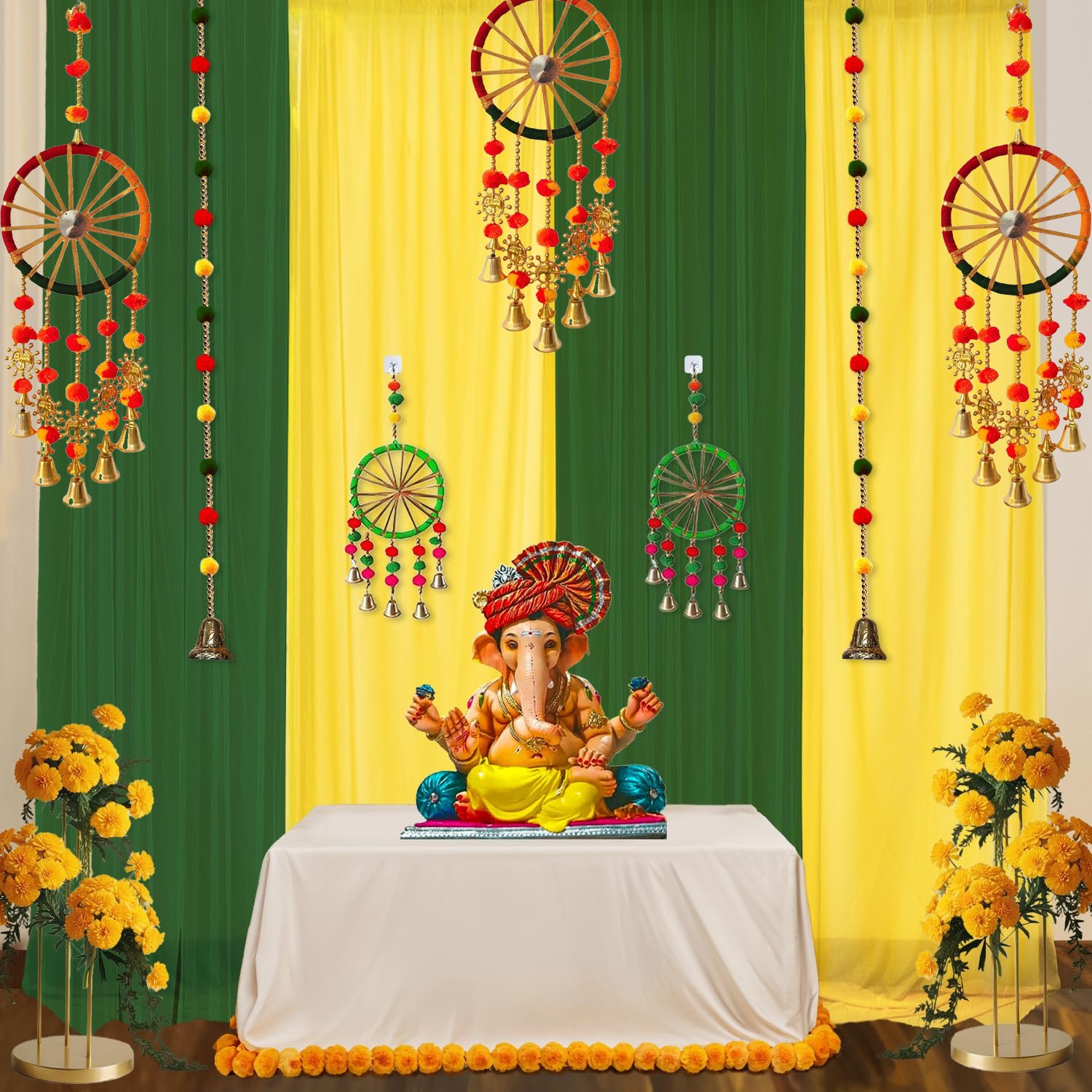 - BACKDROP DECORATION SET: This Green & Yellow Backdrop curtains for decoration includes total 12 pcs, featuring 2Pcs Green & 1pc yellow back drop cloths for decoration ( curtain material is net and satin mix), 2Pcs chakra latkan, 2Pcs pom pom hanging, 4pcs hooks & 1 Pc ribbon. This decoration backdrop cloth adds a festive touch. This pooja backdrop decoration cloth, diwali decoration items for diwali backdrop decoration, navratri backdrop decoration cloth ensures cultural richness perfect for festive backdrop for pooja decoration or haldi decoration items for home, puja decoration items background.
