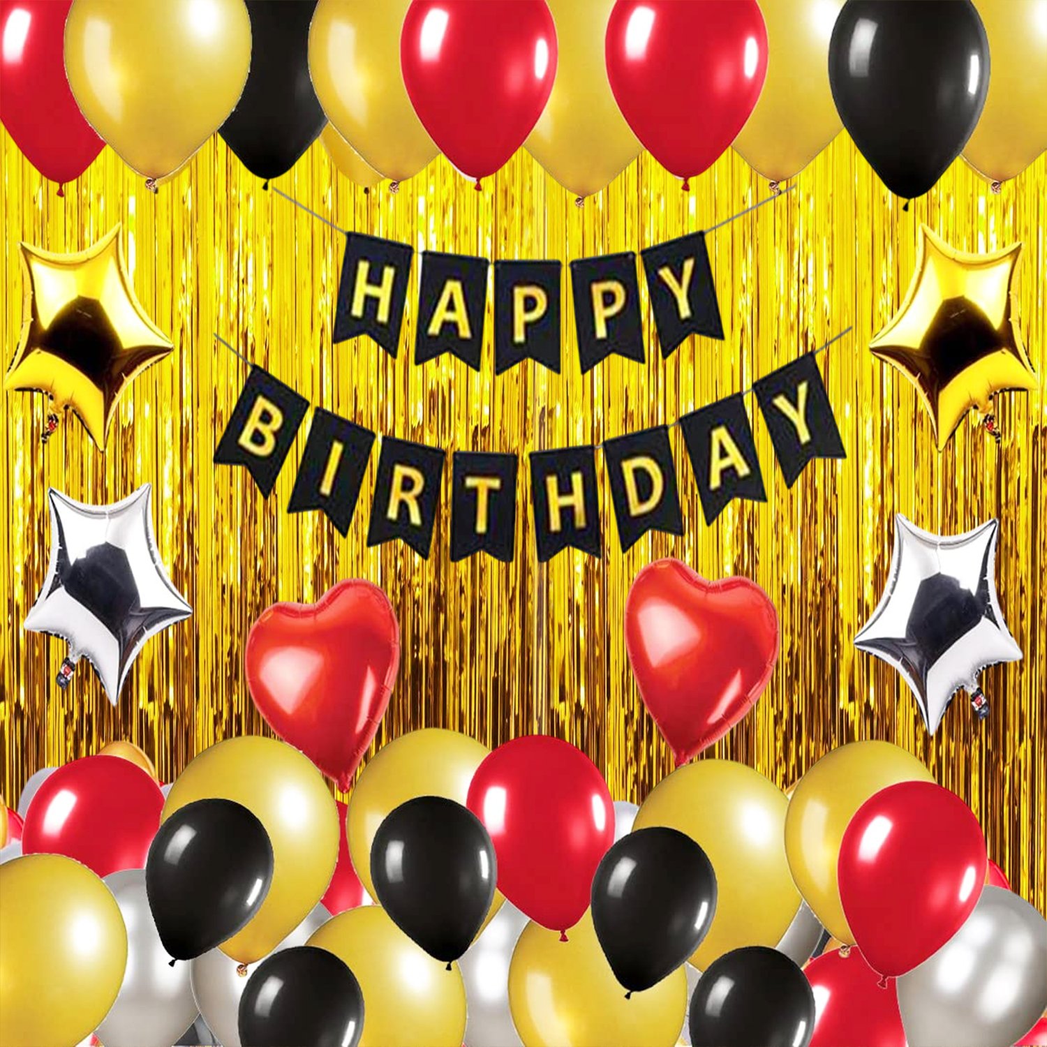 1 set of Black “Happy Birthday” 13pcs alphabet Banner and 36pcs HD Metallic balloons(Golden, Black, Silver, Red) and 4Pcs of Star Balloons (2 Gold, 2 Silver) with 2pcs Heart Balloon with 2Pcs of Golden Curtains