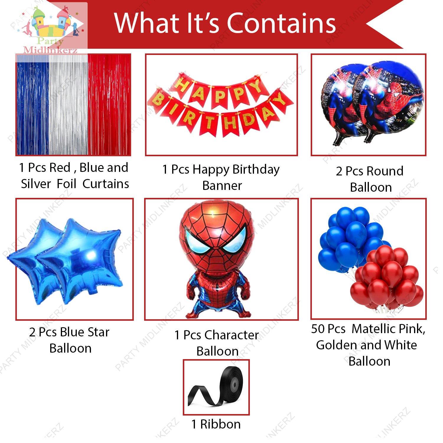 Package includes “HAPPY BIRTHDAY” banner(1set), 15pcs blue metallic, 15pcs red metallic balloons, 1pc blue and 1pc red and1pc silver curtains,2pc blue foil star balloons, 1pc large character foil balloon balloon and 2pcs round character foil balloons,ribbon.