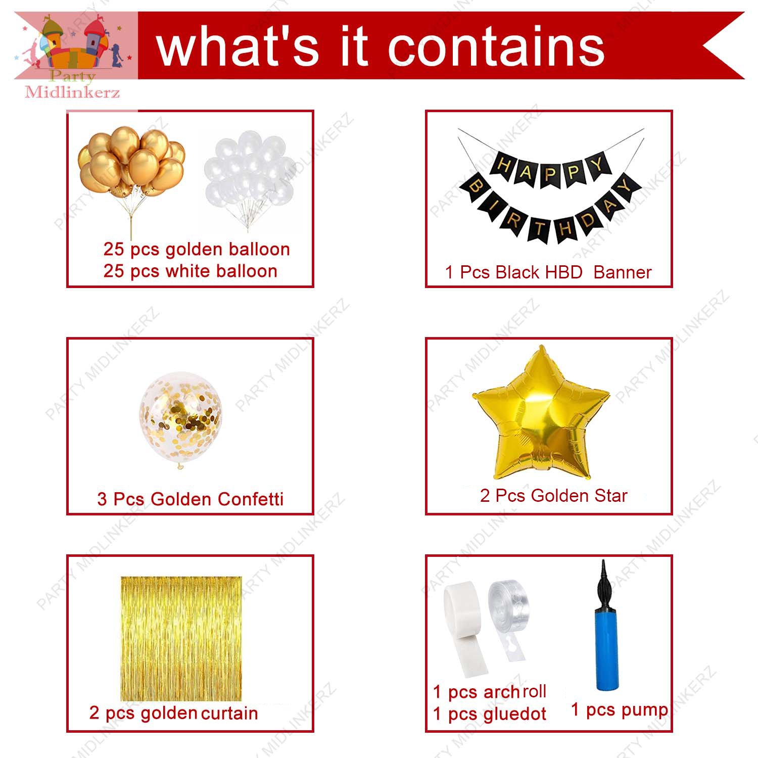 - Happy Birthday Decorations Kit combo Package include 1pc black happy birthday paper bunting, 25pcs golden metallic, 25pcs white metallic, 2pcs star foil balloon, 1pc hand balloon pump, 1pc glue dots and 1pc arch
