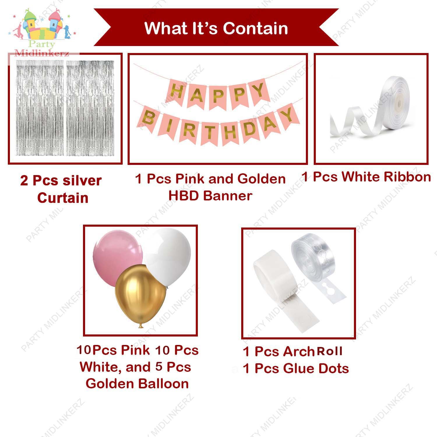 BOX DECORATION ITEMS FOR BIRTHDAY PARTY: 1pc Pink Happy Birthday Banner, 10pcs Metallic Balloon White, 10pcs Metallic Balloon Pink, 5pcs Metallic Balloon Golden, 1pc Silver Foil Curtain SIMPLE YET AMAZING DECORATION KIT- These pink birthday decoration items are included in the decoration kit because while decorating the balloons we need a good wall backdrop, when we put the foil curtain on the wall as a backdrop which makes the birthday decoration more eye soothing. Inflate slowly with air or helium and just fill 90% of the balloons space that could allow the big balloons to expand completely. BUY WITH CONFIDENCE |GUARANTEED SATISFACTION : Stay worry free while buying this pink birthday decoration kit. We are confident of the quality, durability and safety of the product. The trendy kit is properly packed and carefully delivered to you. If the product received is not up to the mark, you can contact us to settle for a or product replacement. CREATE A MEMORABLE PHOTO FOR LIFETIME :Birthday is only once a year, we hope you’ll have fun and invite friends and relatives to celebrate it. You can take photo with the pink birthday decoration kit on the background to make your pictures look more photographic. You just need to enjoy your party