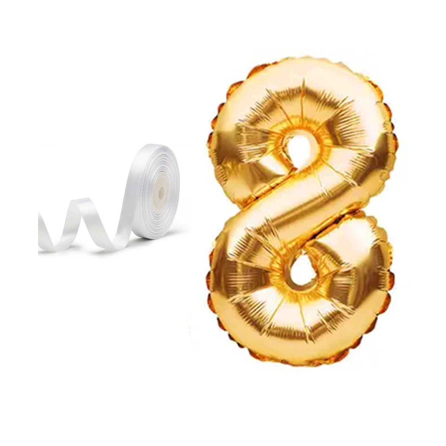 Solid golden ‘8’ number numerical foil balloon with ribbon for celebration (gold, pack of 2)