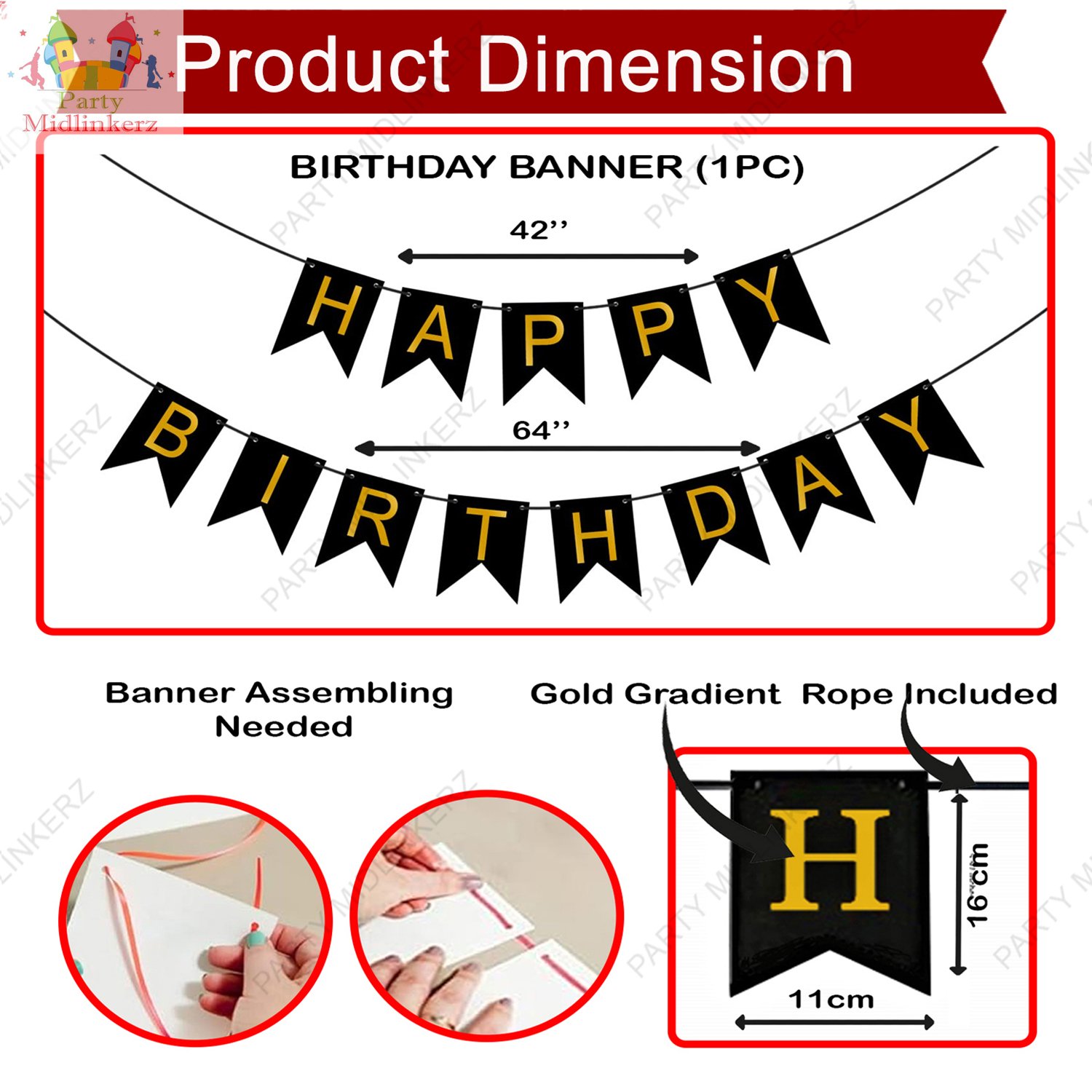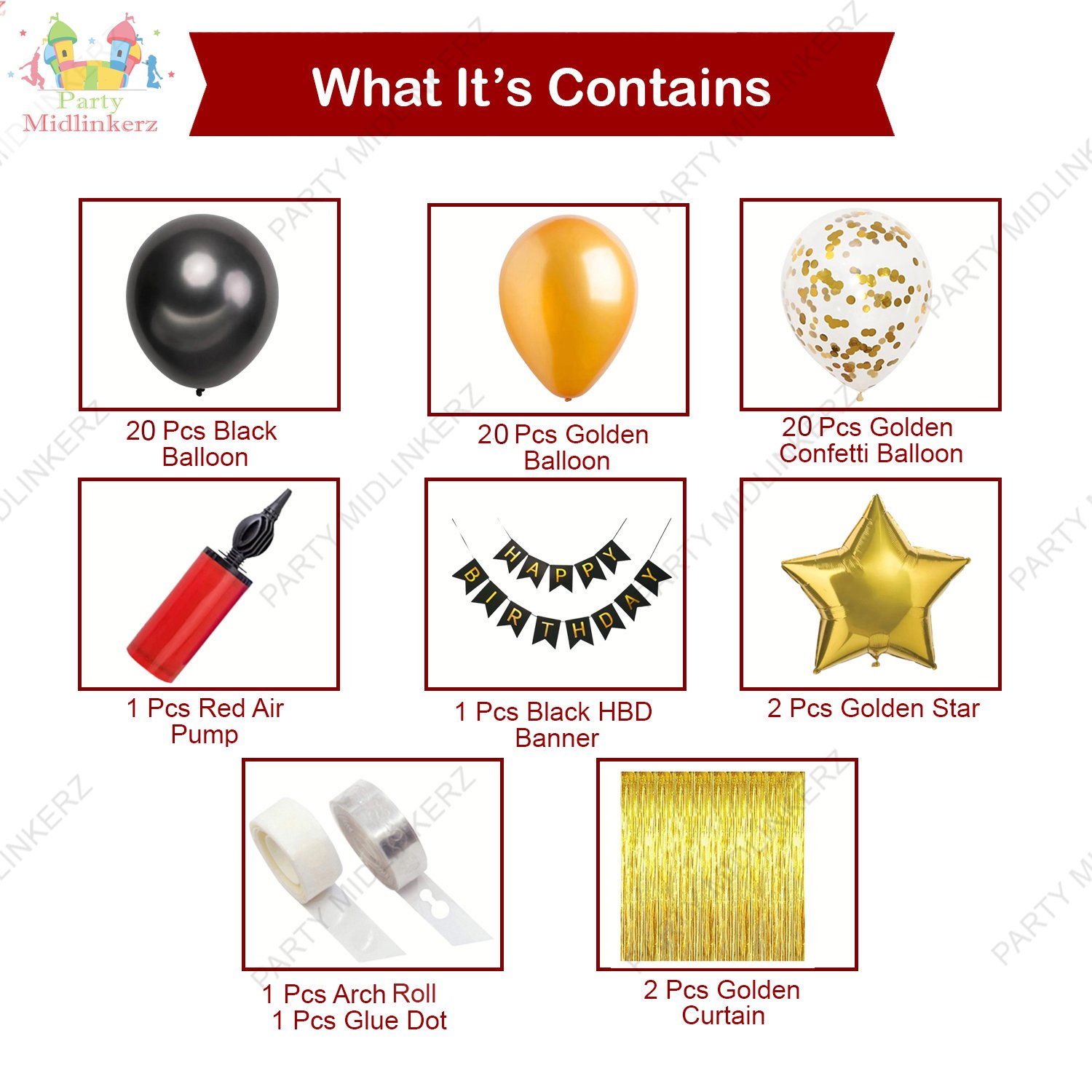 1pc black happy birthday banner (made of thick paper – cardstock), 25pcs golden metallic, 25pcs black metallic, 2pcs goldne foil curtain, 3pcs golden confetti, 2pcs golden star foil, 1pc hand balloon pump, 1pc glue dots and 1pc arch.