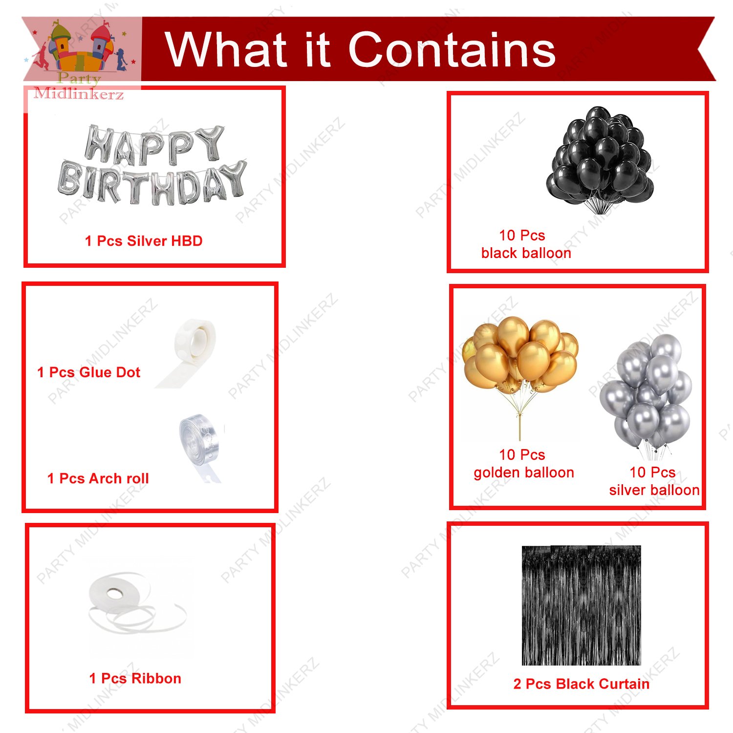- 1 pc banner , 2 pc Curtain , 1 pc ribben , 30 pc balloons