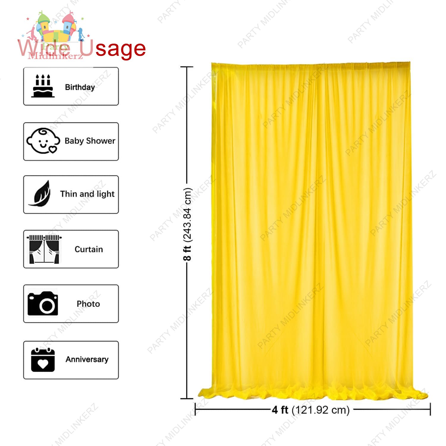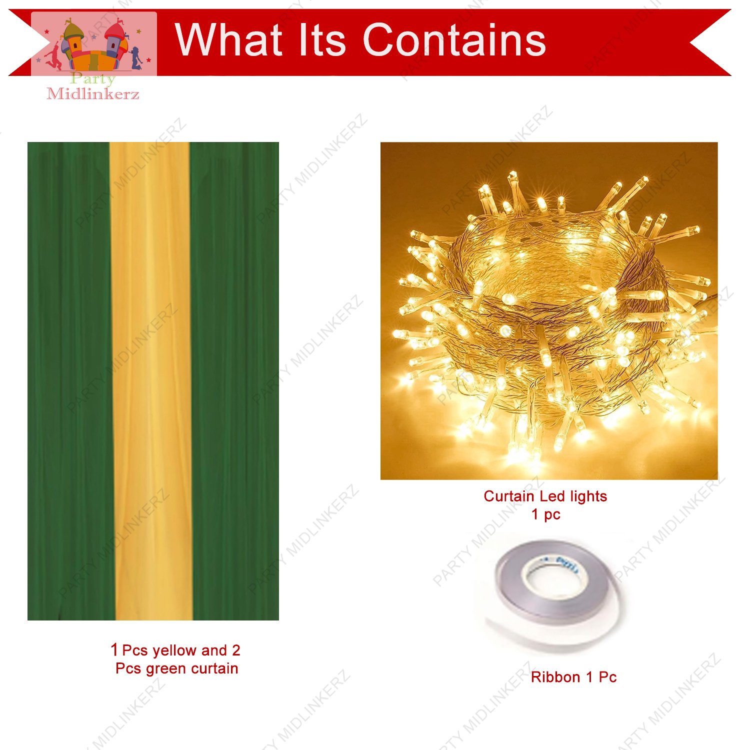 • ENRICHING FESTIVE ATMOSPHERE : Elevate your haldi mehandi decoration with our vibrant traditional backdrop decoration set of 6 pcs, featuring 2 pcs vibrant green and 2pcs yellow satin net mix backdrop cloth for decoration, 1pc curtain Led light (USB Cord) which gives fairy glow and 1pc ribbon.