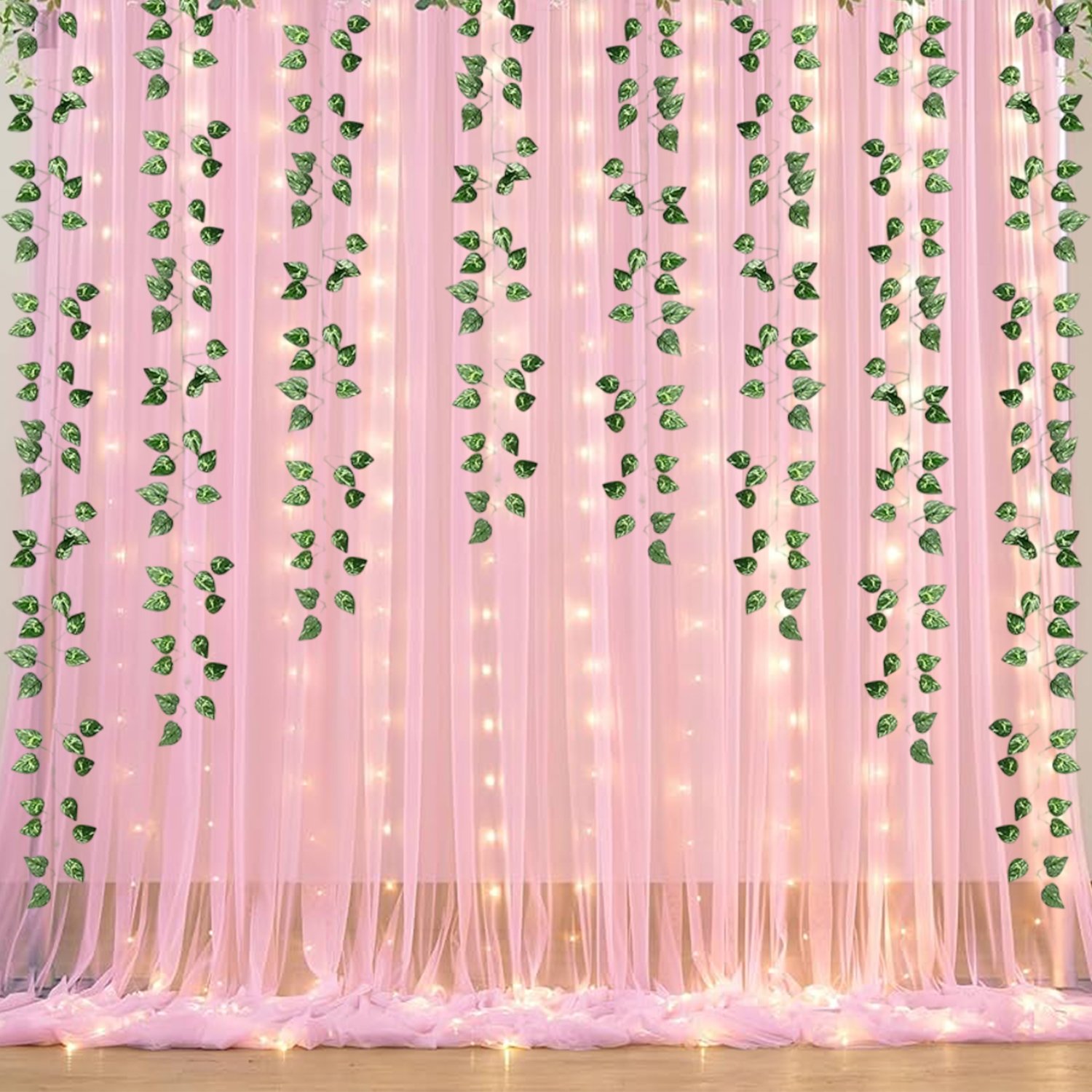 - 2pcs pink net / sheer backdrop curtain , 2pcs green fake / artificial vines for room decor , 1pc string LED light for home decoration , 2pcs hook to hang your backdrop for decoration , 1pc ribbon & 1pc double side tape.